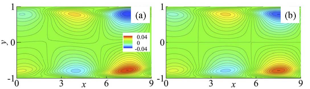 图2. (a) 数值模拟所得波包流向脉动速度等值线,(b) 稳定性理论所得行波模态流向速度等值线。Re=2400.