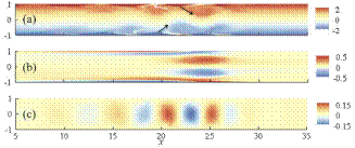 图1. 槽流中局地波包的 (a) 瞬时涡量场、(b) 平均流修正部分的涡量、(c) 脉动流场的法相速度。Re=2400.