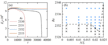图4. (a) 扰动动能随时间的演化。初始流场含波包数N = 8。(b) ■和x符号分别表示在40000时间单位内初始波包存活与衰减掉的算例。计算域长度L = 400。