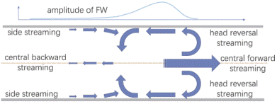 再次,周期变化的脉动场对应的雷诺应力会产生漂流(streaming)从而影响平均流。通过分析脉动场的雷诺应力分布,发现在波包下游头部的中线处会形成指向下游的漂流,而在近壁处漂流会反转为指向上游,即头部处的漂流会强化涡对流动(图3)。这些结果给出了槽流中局地波包的自维持机制,即波包中的行波和头部的涡对是共生的关系:涡对造成的平均流修正可产生有限幅值的行波,而行波的雷诺应力有利于维持涡对、防止其因粘性扩散与耗散而衰减掉。