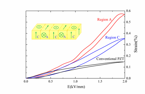 近年来学者们采用各种方法来提高压电材料的致动应变,主要有三类途径:1)发展弛豫型铁电单晶(如PMN-PT,PZN-PT),通过电场诱导相变来提高其电致应变;2)发展无铅压电陶瓷,同样通过电场诱导的铁电相变产生大应变;3)通过可逆的铁弹畴变来实现大的电致应变。但这些方法或者由于稳定性不好,或者电场和滞回太大,或者需要施加预应力,不能真正在工业中得到应用。