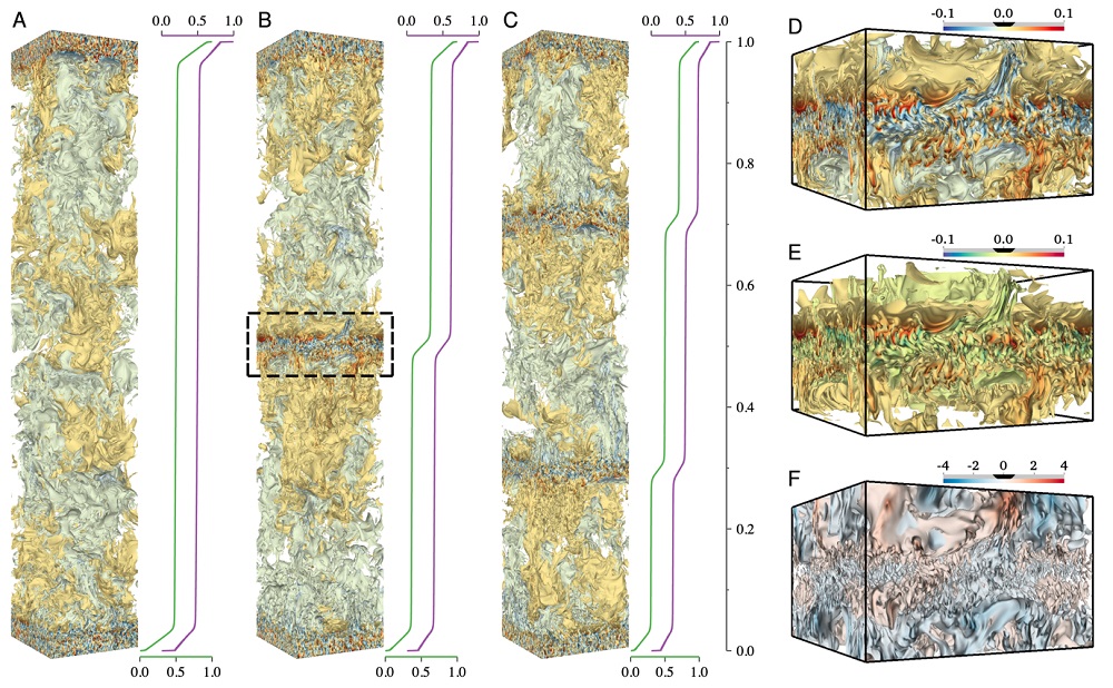 工学院杨延涛课题组利用大规模直接数值模拟方法针对极高控制参数下的温盐驱动双扩散对流开展系统性研究,重点关注盐指型双扩散对流中流场形态随控制参数的变化趋势,以及对应的热量和盐度输运规律。研究发现在温盐双扩散对流系统中,相同全局流动参数下可能出现完全不同的流场形态,即盐指型双扩散对流湍流存在多态现象。不同形态可由不同初始温盐分布决定,如图1所示;也可由流动参数的不同演化过程建立。温盐台阶流态向单一盐指界面流态的转变过程中存在迟滞现象。分析表明,经典的热流和盐流参数化模型不能同时描述温盐台阶内盐指界面和单一盐指界面的输运特性;如果同时考虑盐指界面温盐梯度和界面厚度,则针对不同类型盐指界面能够建立统一的参数化模型。