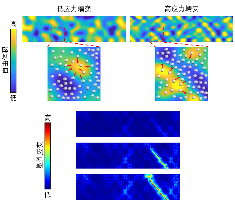 图1. 上图:金属玻璃蠕变的两种微观粒子流动机制。低应力下原子由热能梯度驱动向自由体积更大(更松散)的区域迁移,高应力下原子由应变能梯度驱动向自由体积更小(更密实)的区域迁移从而促进剪切带的萌生。下图:单轴拉伸下主剪切带的萌生与发展