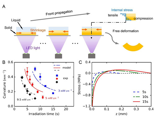 图2. (A)正面光聚合自弯曲原理示意图。(B)正面光聚合自弯曲实验与理论预测。(C)光固化高分子膜中残余内应力的建立。