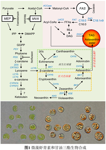 微藻是古老的微生物,绝大多数能够进行光合作用,固定CO2并释放氧气,是地球碳-氧循环的重要参与者;保守估计,藻类固定了地球上超过40%的CO2,是地球至关重要的初级生产力。微藻具有光能利用效率高、生长快、环境适应性强、可在多种培养模式下生长、不与粮争地等多方面的优势,被誉为理想的光驱细胞工厂。微藻能将固定的CO2转化成油脂和碳水化合物等储能物质,以及一系列的高值产物,包括类胡萝卜素(如虾青素、岩藻黄素、叶黄素等)和多不饱和脂肪酸(如EPA、DHA、ARA等)。其中,佐夫色绿藻(Chromochloris zofingiensis)易培养,能够在多种营养模式下合成积累虾青素和甘油三酯(TAG),且有染色体水平的全基因组序列,被认为是研究类胡萝卜素生成和脂质生成的新兴模式藻和实现油脂和虾青素多联产的重要种质资源之一。