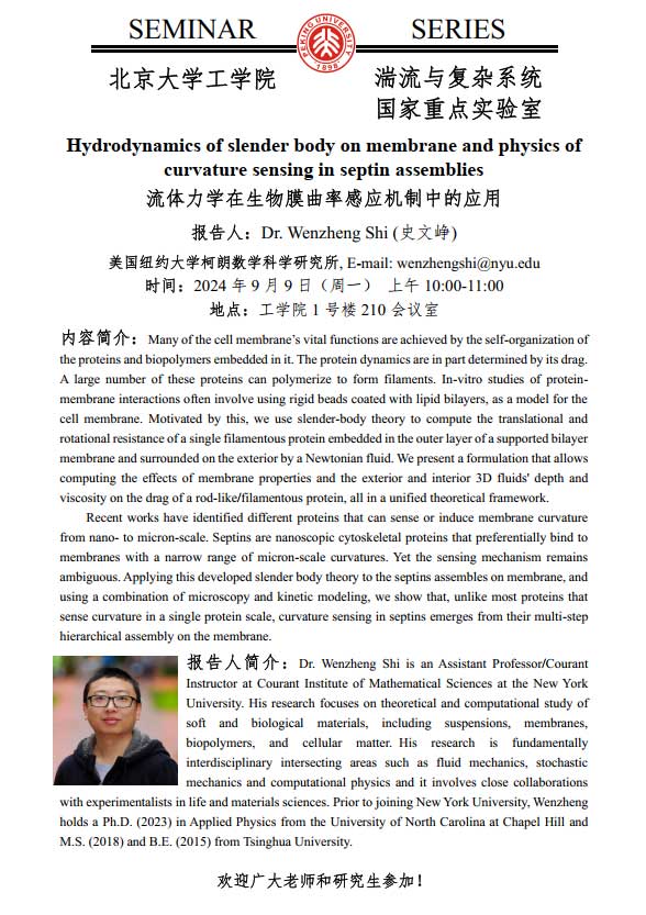 湍流学术报告【9.9史文峥】:Hydrodynamics of slender body on membrane and physics of curvature sensing in septin assemblies