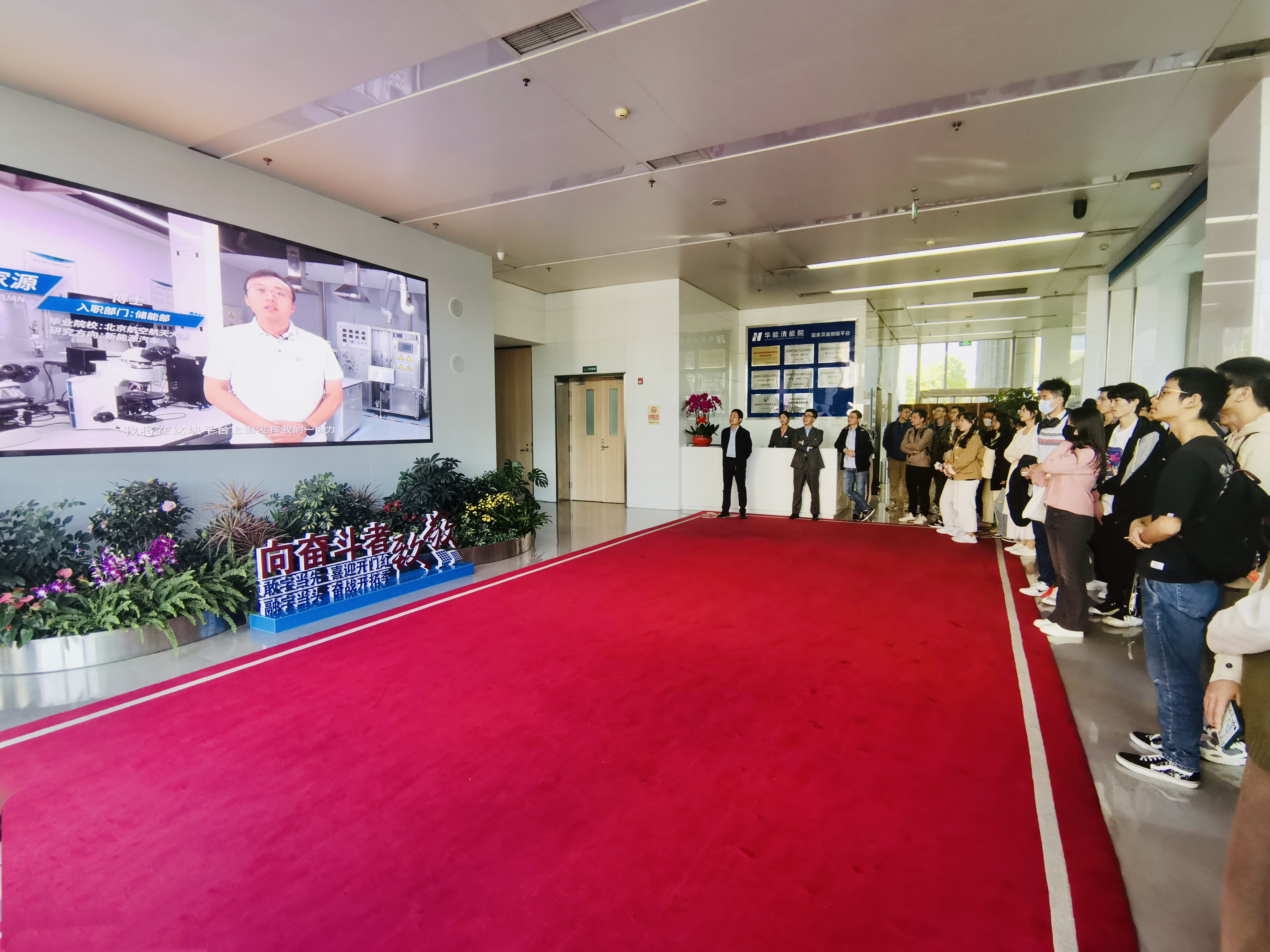 26日中午13:20左右,师生一行到达了华能清能院。院长助理兼人资部负责人李晨和随行工作人员对师生们的到来表示了热烈的欢迎,并通过一则短片为师生们详细介绍了华能集团以及华能清能院的企业规模、发展目标、贡献成果、以及能源战略布局等。