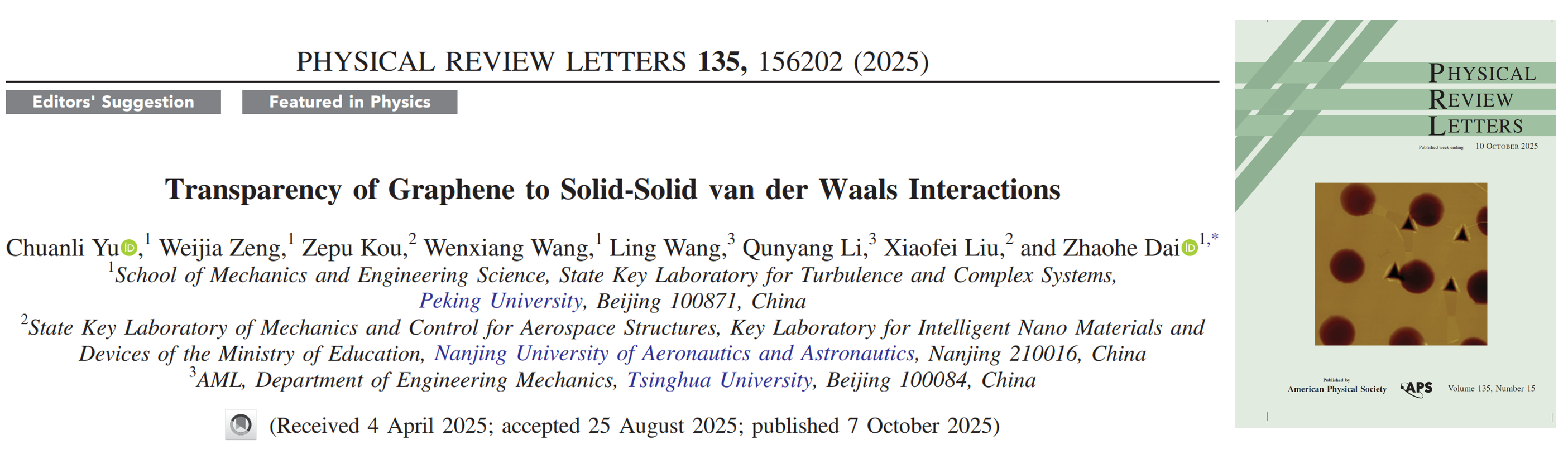 范德华作用是最基本的分子间作用力之一。虽然同质结构间的范德华作用在20世纪已得到了系统的理论研究和精细的实验表征,但对于异质结构(尤其是工程应用中常见的薄膜-基底体系),其作用是否可以通过分子间相互作用的简单体积积分来叠加,长期以来存在理论和实验上的争议。北京大学力学与工程科学学院力学系戴兆贺研究员及合作者近期围绕这一基础问题,以“Transparency of graphene to solid-solid van der Waals interactions.”为题,于物理领域旗舰期刊《Physical Review Letters》发表论文。该工作被选为封面和编辑推荐论文,并被Physics Magazine报道。