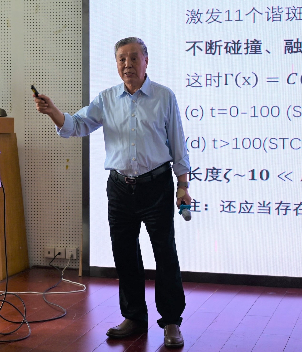 随后,北京大学应用物理与技术研究中心荣誉主任贺贤土院士作了题目为《斑图动力学和时空混沌》的学术报告。贺院士首先对斑图的概念及其意义进行了简要介绍;讲解了连续介质近可积系统与耗散系统的斑图动力学和时空混沌等前沿科学问题;最后,贺院士总结指出斑图动力学研究可以了解系统的统计特性及不同形式斑图能量、动量或质量传输的共性。