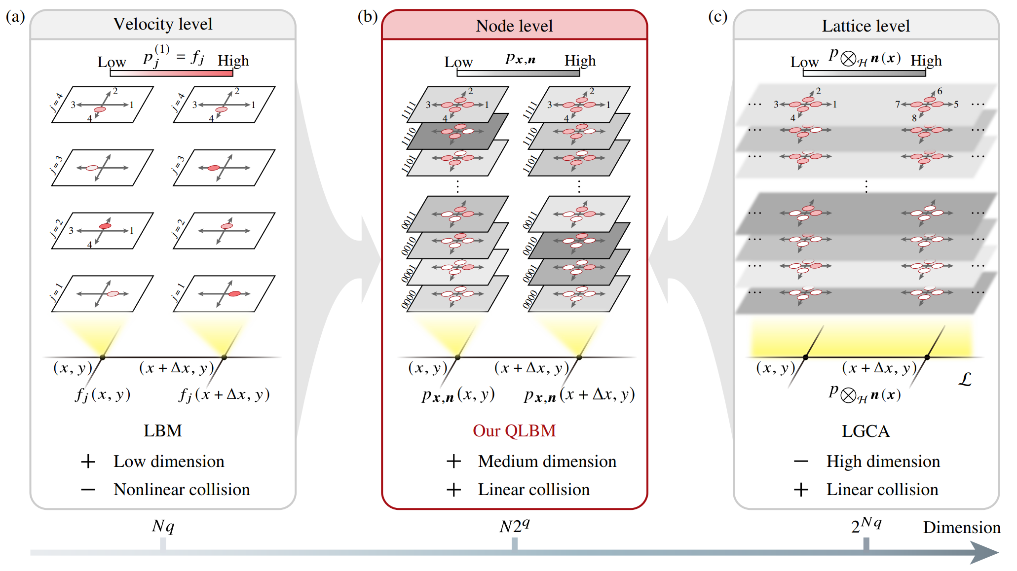 针对这一瓶颈,北京大学力学与工程科学学院杨越课题组提出了一类新型的量子格子玻尔兹曼方法(QLBM),为在量子计算框架下模拟湍流等非线性动力学问题提供了可行方案。该方法的核心创新在于引入网格点层面的统计系综描述,将非线性的流体动力学系统,转换至多项式级升维空间内的线性格子气系统。这一转换融合了传统格子玻尔兹曼方法在建模上的高效性与格子气自动机在粒子碰撞操作上的线性特质,从而与量子硬件的运算特性更好兼容。