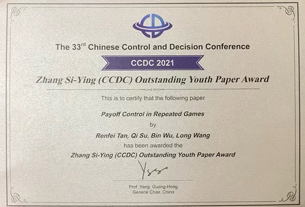 2021年5月22日至24日,第33届中国控制与决策会议(CCDC 2021)在云南昆明成功举办。北京大学工学院18级本科生谈任飞同学的论文在先进制造与机器人系王龙教授的指导下荣获了此次会议的最高奖项——张嗣瀛优秀青年论文奖,论文题目为《Payoff control in repeated games(重复博弈中的收益控制)》。这是该奖项自设立以来首位本科生获此殊荣。