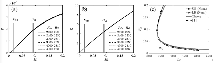 图2. 局地波包在不同雷诺数Re的衰减过程中(a) P和(b)D 随扰动动能Ek的变化。模拟所用初始扰动为在Rei所得的局地波包。Ek1和Ek2是Ek 衰减曲线上两个拐点处的扰动动能。(c) 公式(2)所得稳态解的Ek(Re)曲线(灰实线)同数值模拟的比较。[2]