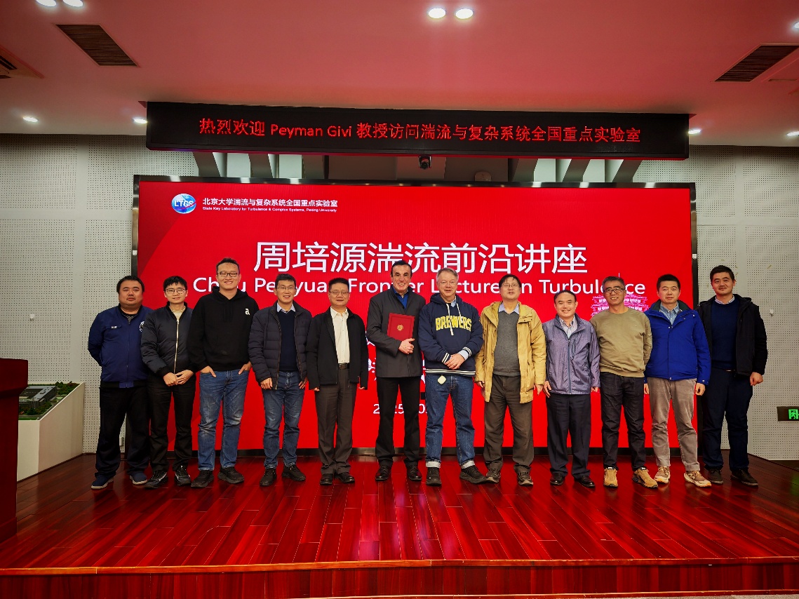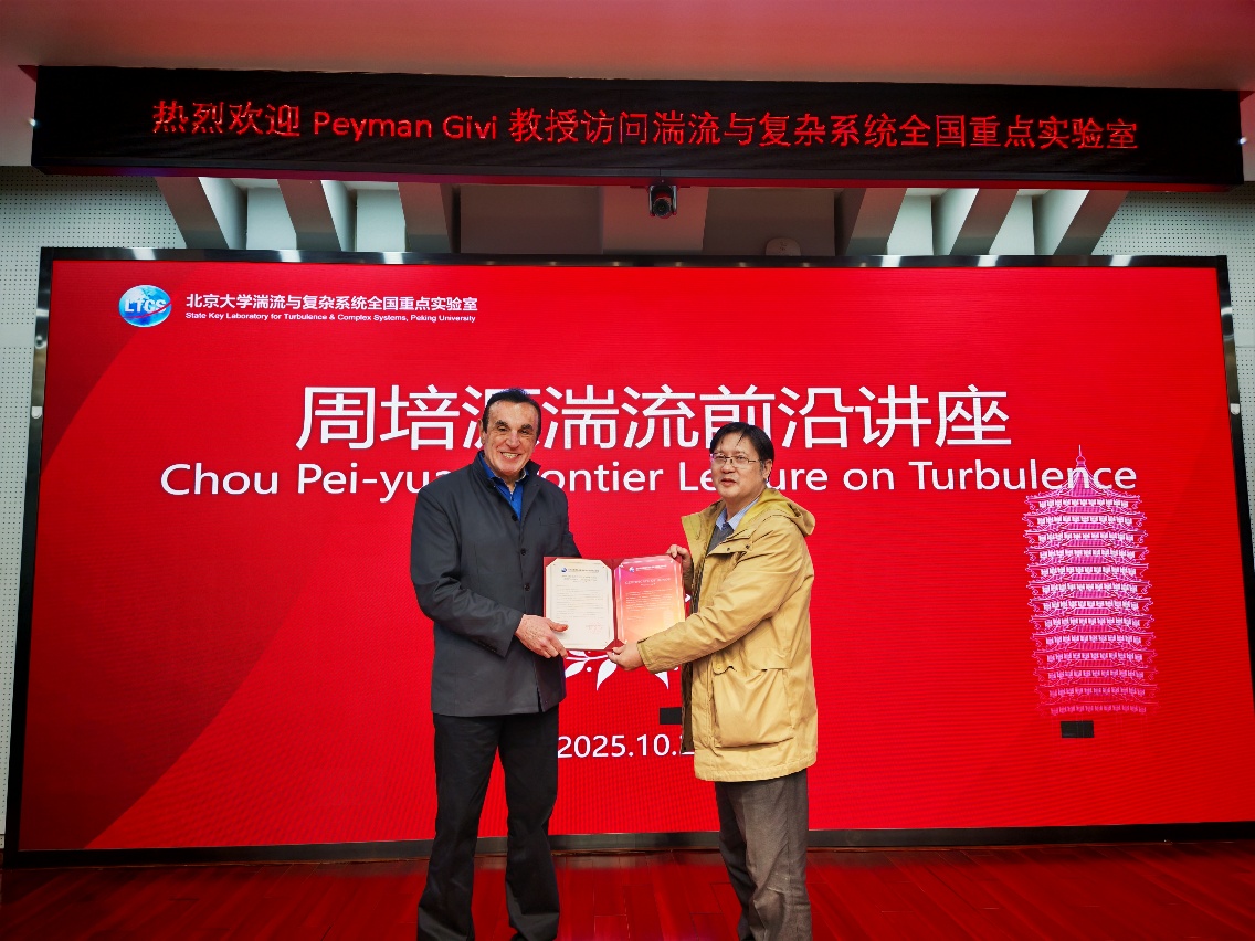 为感谢Peyman Givi教授的学术分享及其对实验室国际交流合作的支持,湍流与复杂系统全国重点实验室主任李存标教授代表实验室向其颁发“周培源湍流前沿讲座”专属证书及感谢信。李存标教授在致辞中表示,期待以此次交流为契机,推动双方在湍流研究新领域的深度合作,共同开辟学科发展的广阔前景。